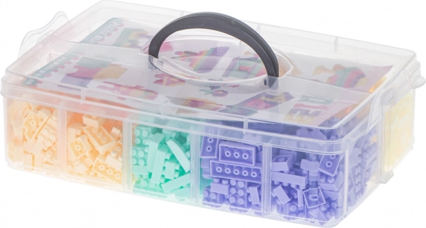 Caurspīdīga kaste ar nodalījumiem ļauj viegli glabāt un kārtot klucīšus pēc krāsām.