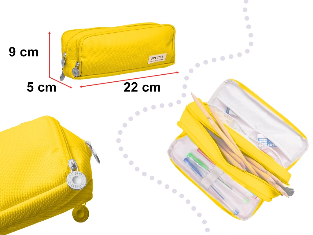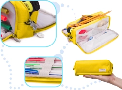 Praktisks trīskameru penālis 3-in-1 skolai, birojam un ceļošanai. Pateicoties trim rāvējslēdzēja nodalījumiem, visas rakstāmpiederumu lietas būs pārskatāmi sakārtotas un droši uzglabātas. Iekšējās kabatiņas un elastīgās gumijas nodrošina, ka katram piederumam ir sava vieta. Kompaktie izmēri taupa vietu mugursomā, bet izturīgais poliesters garantē ilgu kalpošanas laiku. Daudzfunkcionāls pielietojums, 3 atsevišķas kameras, izturīgs materiāls un teicama organizācija.