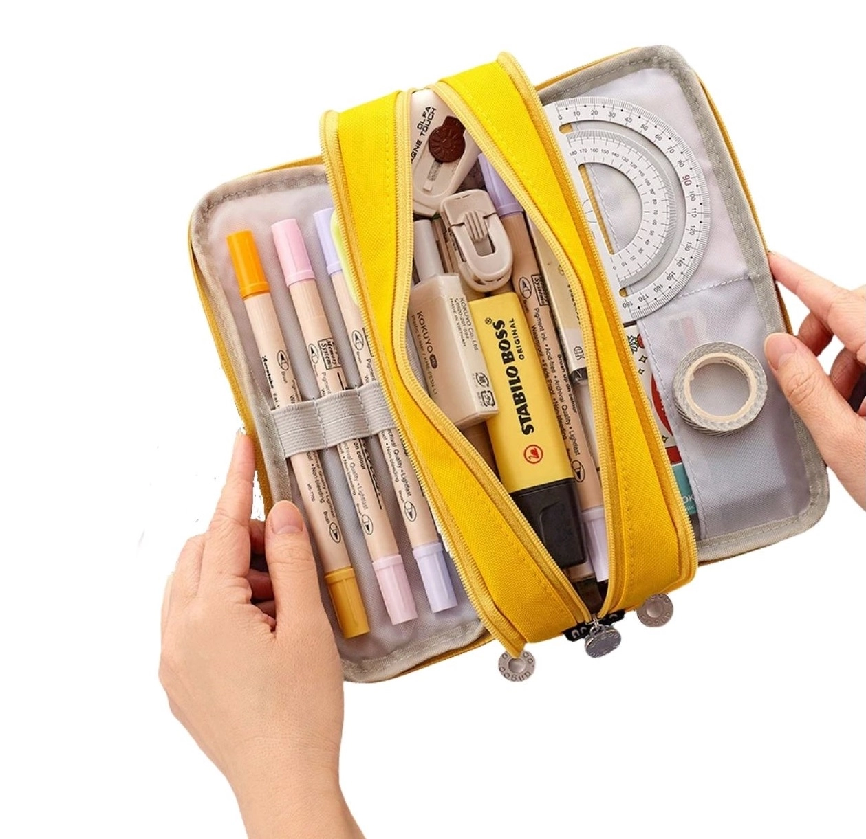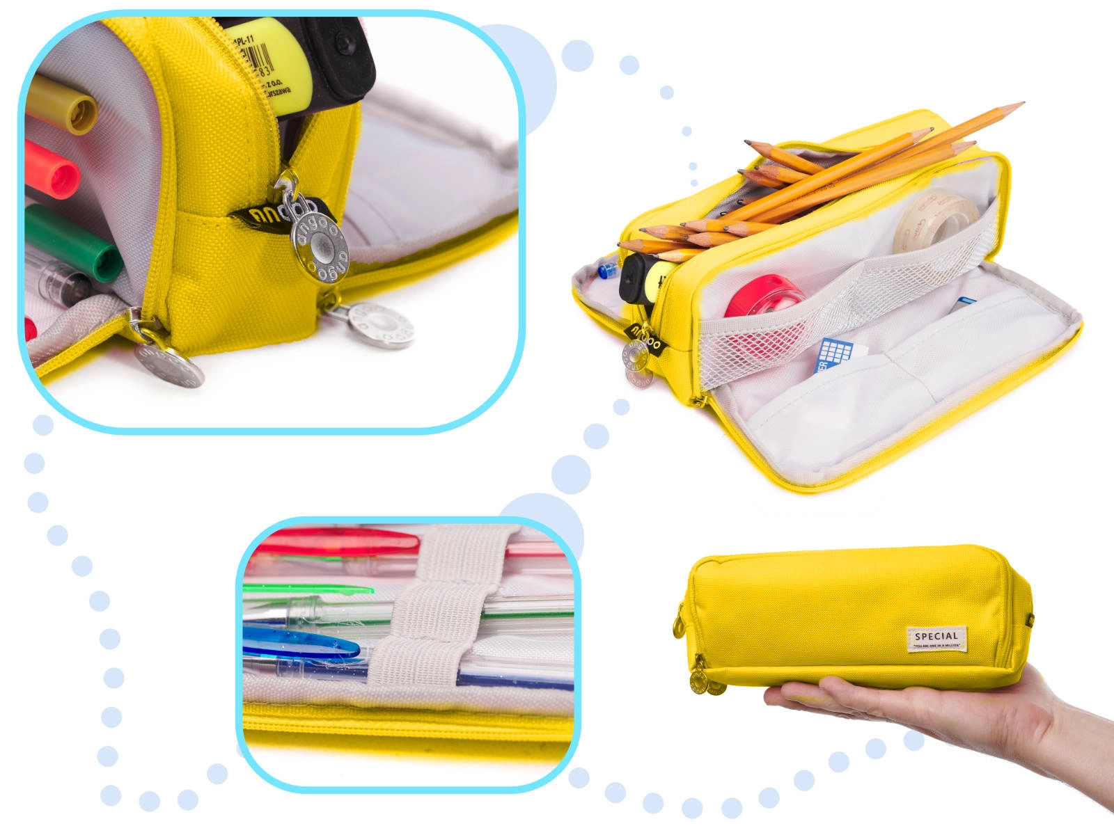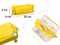 Vairs nekādas nekārtības somā. Šis daudzfunkcionālais penālis ar 3 atsevišķām rāvējslēdzēja kamerām ietilpina zīmuļus, pildspalvas, marķierus, lineālu un sīkumus. Pateicoties iekšējām kabatām un elastīgajām siksniņām, viss būs pa rokai un perfekti sakārtots. Lieliski noder arī kā kosmētikas somiņa vai ceļojumu organizētājs.
