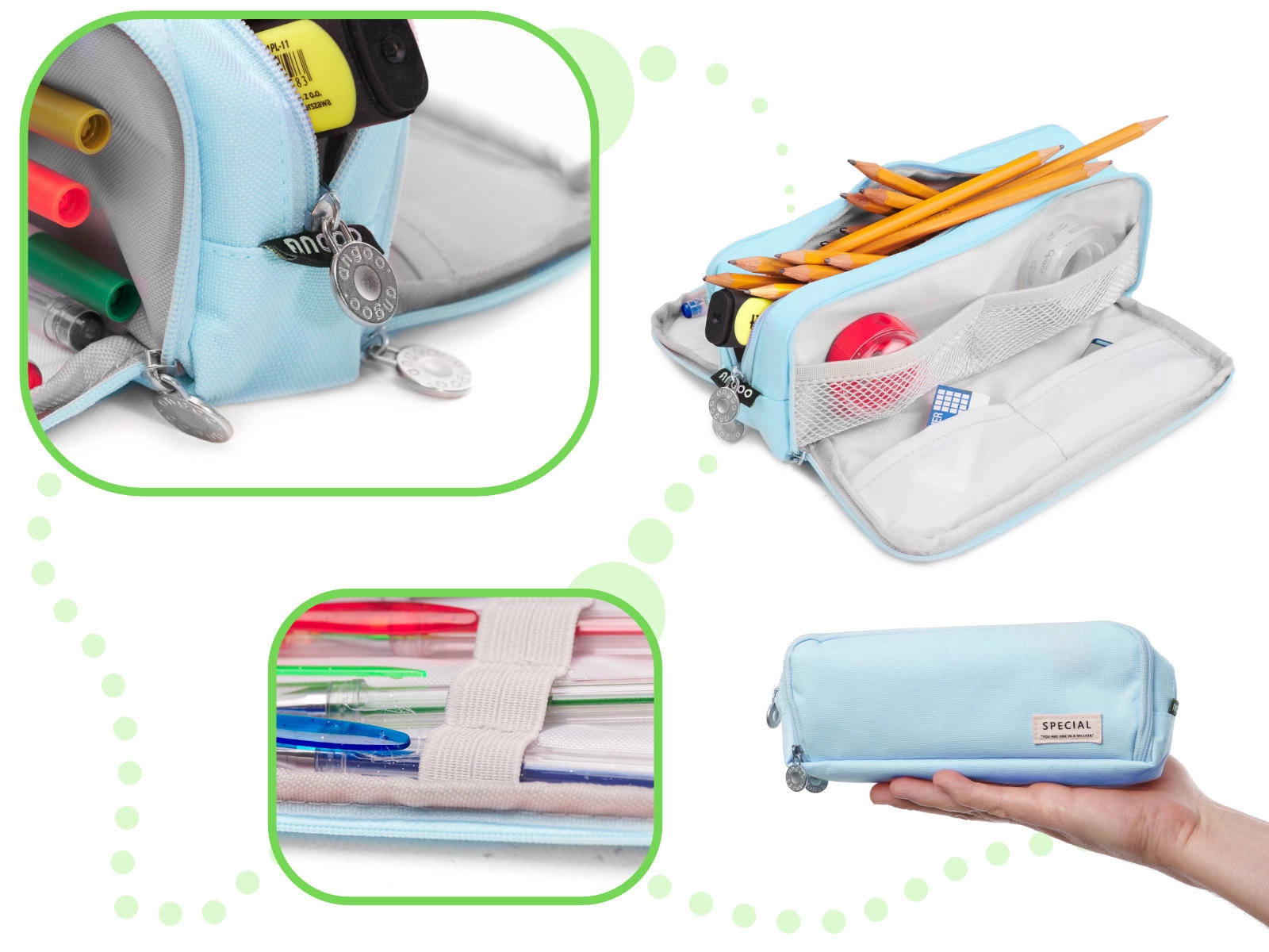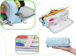 Praktisks un ietilpīgs skolas penālis 3 vienā ar trim atsevišķām nodalījumiem ar rāvējslēdzēju palīdzēs uzturēt kārtību skolas piederumos un kosmētikā. Pateicoties kompaktajiem izmēriem, tas viegli ietilpst mugursomā vai rokassomiņā un kalpos arī kā ceļojumu maciņš vai maks. Izgatavots no izturīga poliestera, lai nodrošinātu ilgu kalpošanas laiku un pārskatāmu organizāciju ikdienas sīklietām.