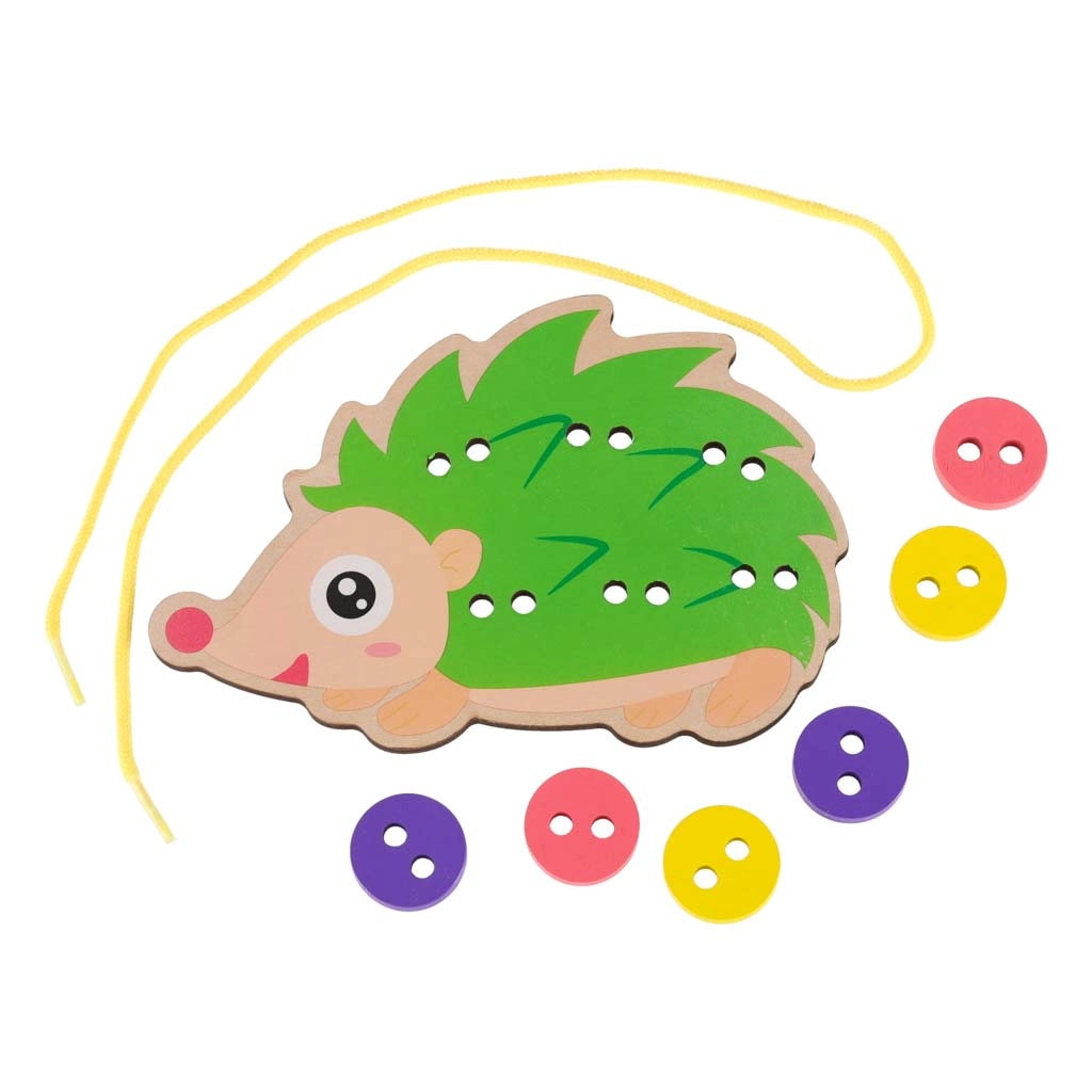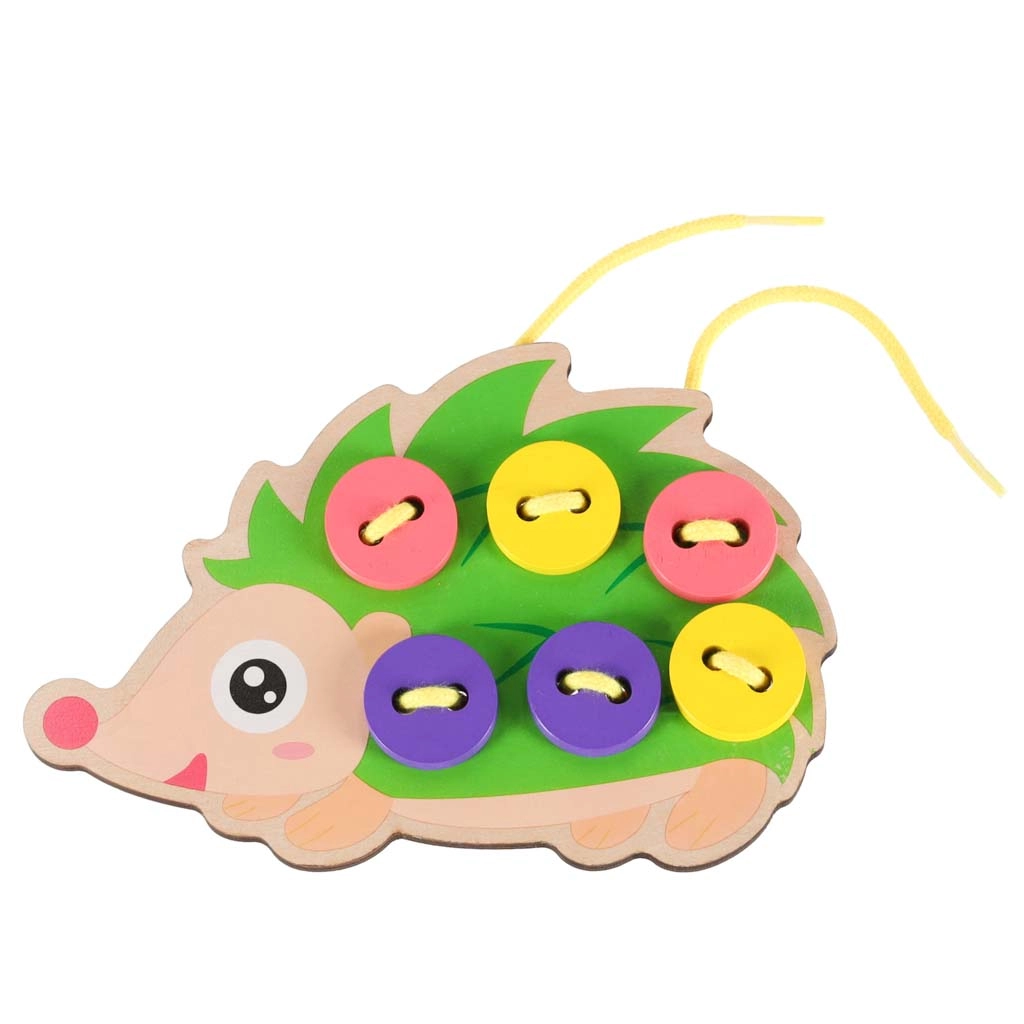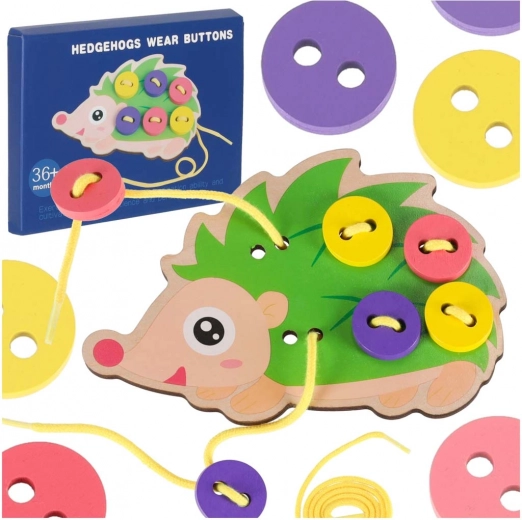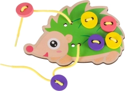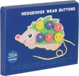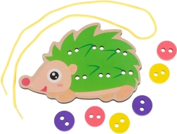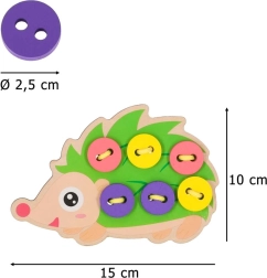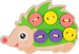 Šis ievēršanas ezītis ir ideāls palīglīdzeklis pirmajiem soļiem šņorēšanā un “šūšanā”. Bērni ver aukliņu caur caurumiem un piestiprina krāsainas pogas pie ezīša “adatiņām”. Košās, piesātinātās krāsas dabiski aicina rotaļāties un māca atšķirt krāsas un formas.