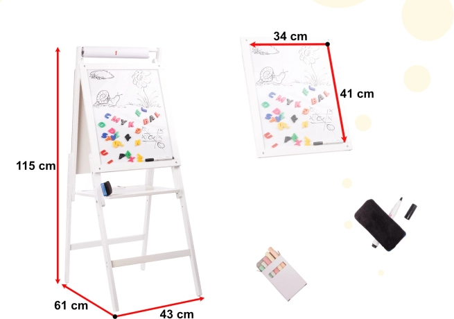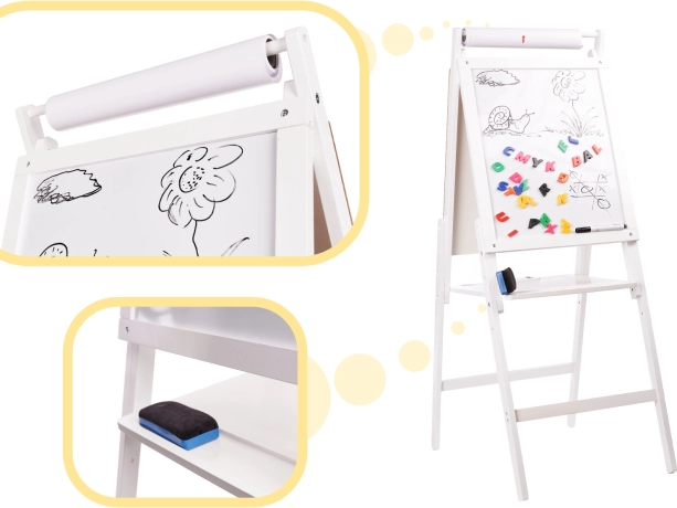 Mēs piedāvājam lielisku rotaļlietu, kas apvieno izklaidi ar mācīšanos. Divpusējā tāfele palīdz attīstīt prasmes rakstīšanā, skaitīšanā un burtu apgūšanā. Pateicoties stabilajai koka konstrukcijai, tāfele ir stabila un viegli lietojama jebkurai nodarbei.