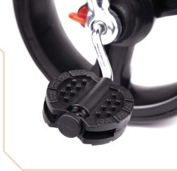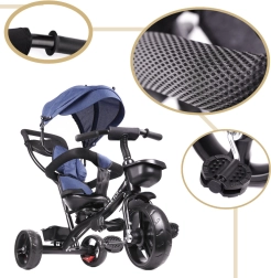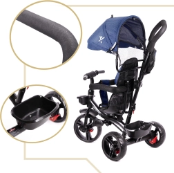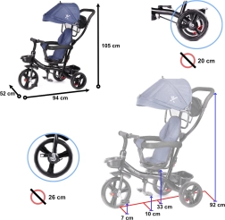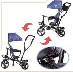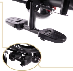 Maksimālai kontrolei ir 360° grozāms sēdeklis, kas ļauj braukt gan pret vecāku, gan braukšanas virzienā. Brīvgaitas funkcija ļauj vecākam ar vienu slēdzi pārņemt piedziņu. Bezkameru riteņi sniedz komfortu kā piepūšamie, bet bez raizēm par spiedienu un defektiem. Ir arī trīs pozīciju salokāms jumtiņš ar sietiņu, noņemams vadotnes kāts ar putu pārklājumu un praktiski glabāšanas piederumi.