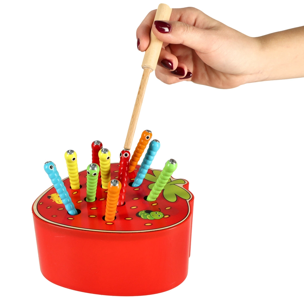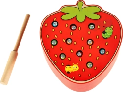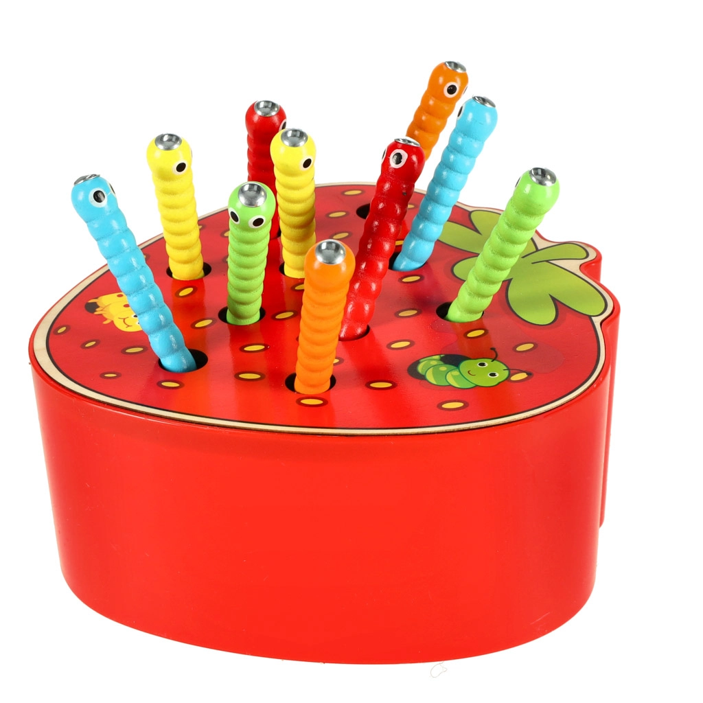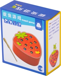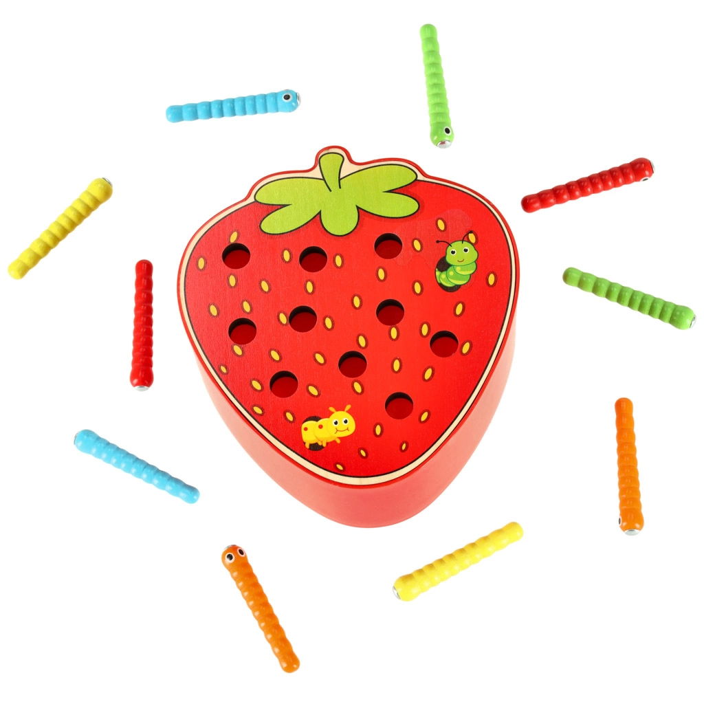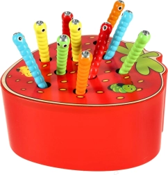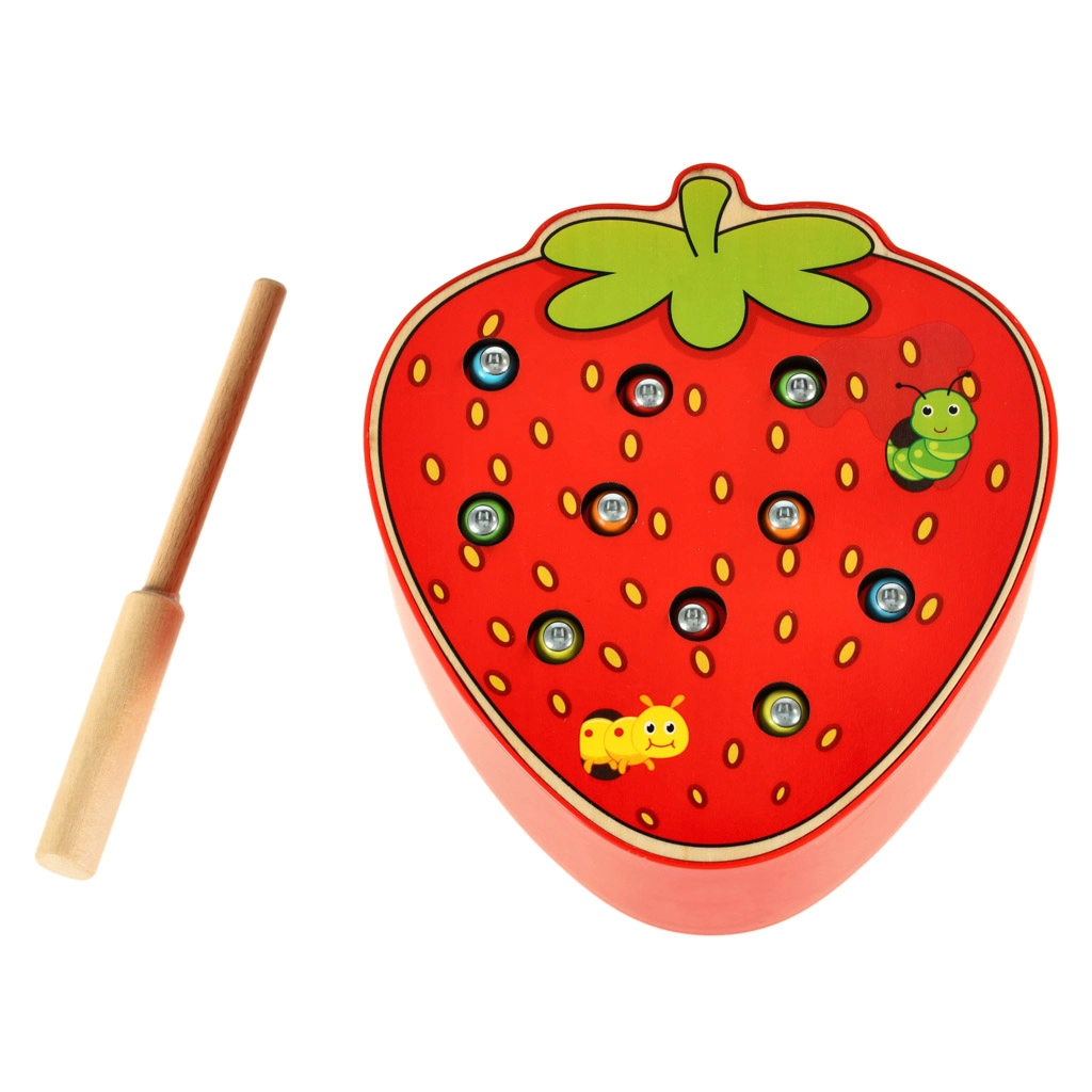 Šī magnētiskā spēle zemenes formā izklaidēs bērnus stundām ilgi. Zemenes “ķermenī” paslēpti 10 krāsaini kāpuriņi ar metāla galiem, kurus bērns ar magnētu koka nūjiņā noķer un izvelk. Sarežģītākā varianta uzdevums — pēc noķeršanas kāpuriņus precīzi ielikt atpakaļ savās vietās.