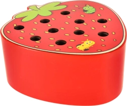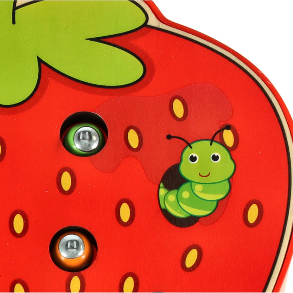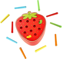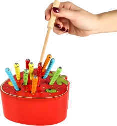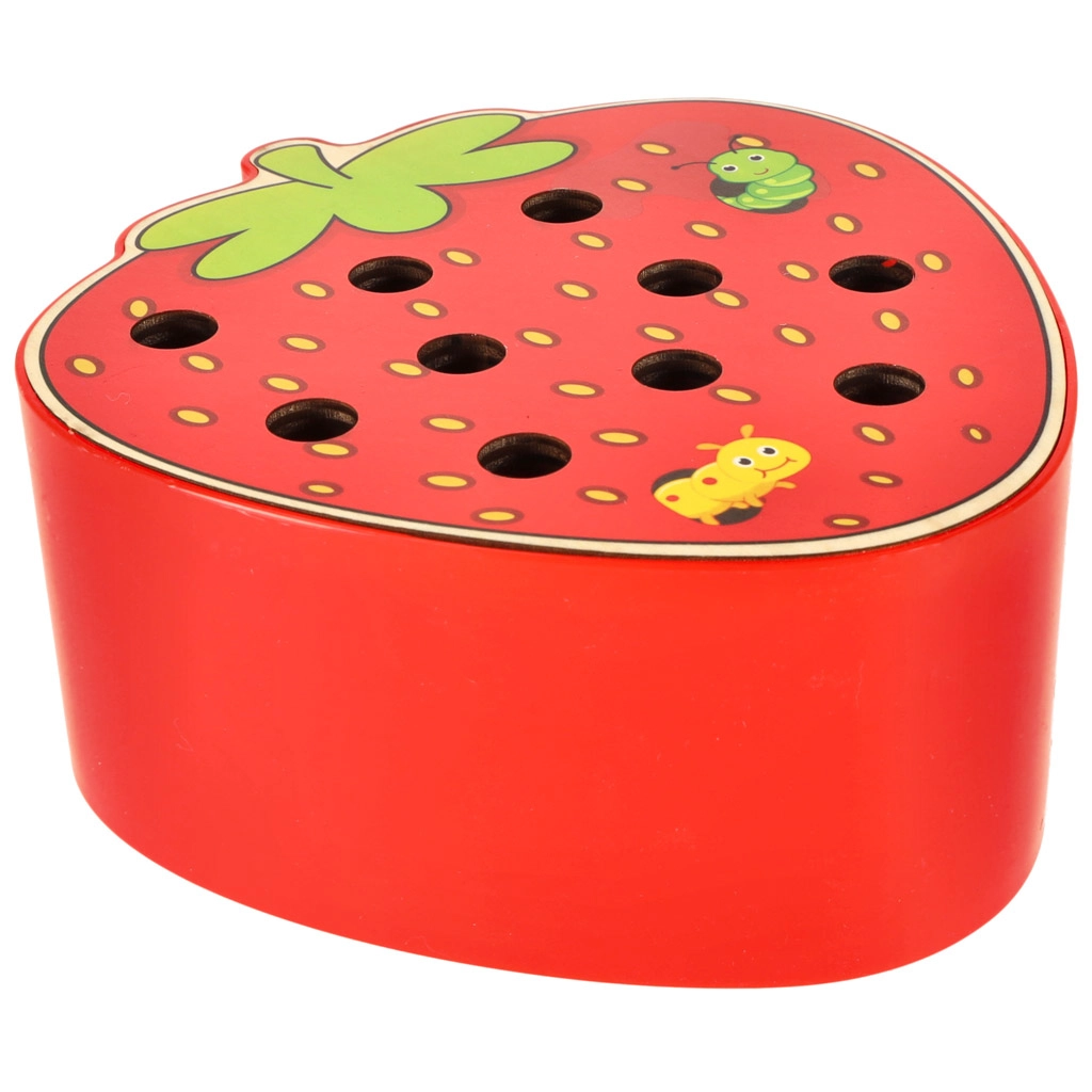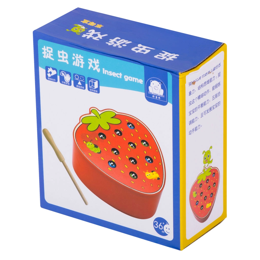 Šī magnētiskā spēle zemenes formā izklaidēs bērnus stundām ilgi. Zemenes “ķermenī” paslēpti 10 krāsaini kāpuriņi ar metāla galiem, kurus bērns ar magnētu koka nūjiņā noķer un izvelk. Sarežģītākā varianta uzdevums — pēc noķeršanas kāpuriņus precīzi ielikt atpakaļ savās vietās.