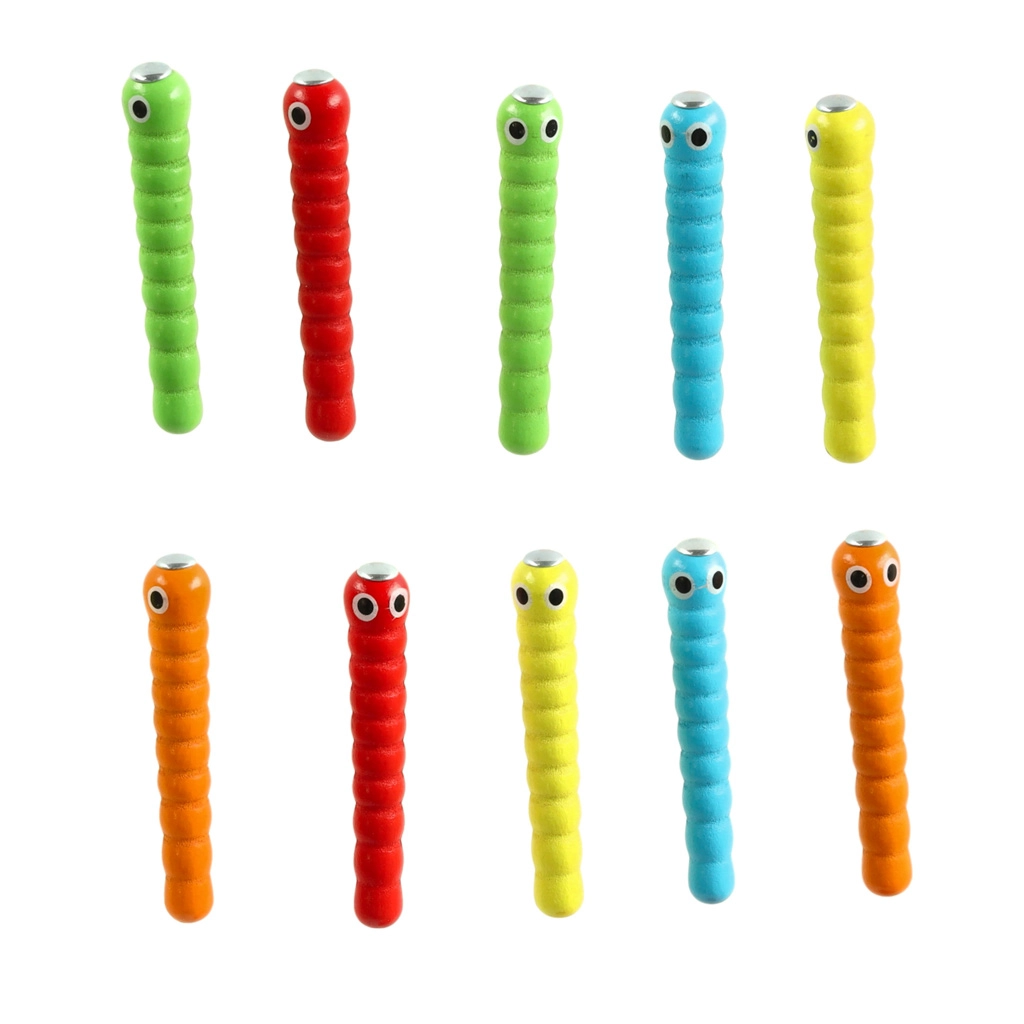 - Pilns komplekts: koka pamatne zemenes formā, 10 krāsaini kāpuriņi, magnētiskā nūjiņa.