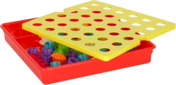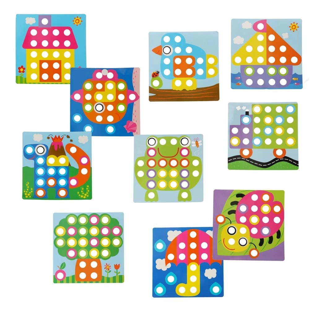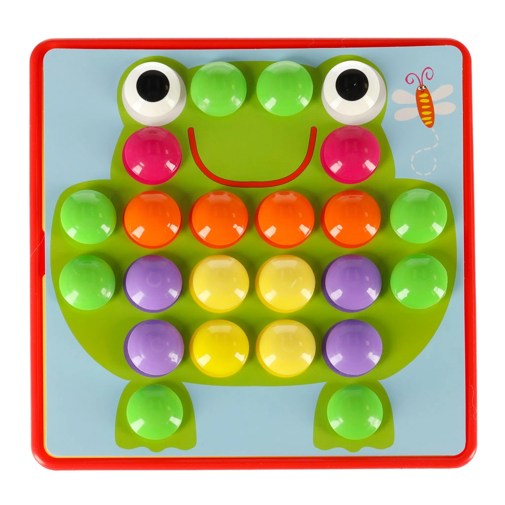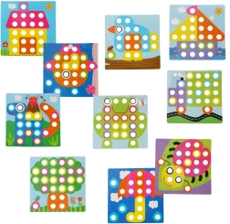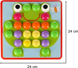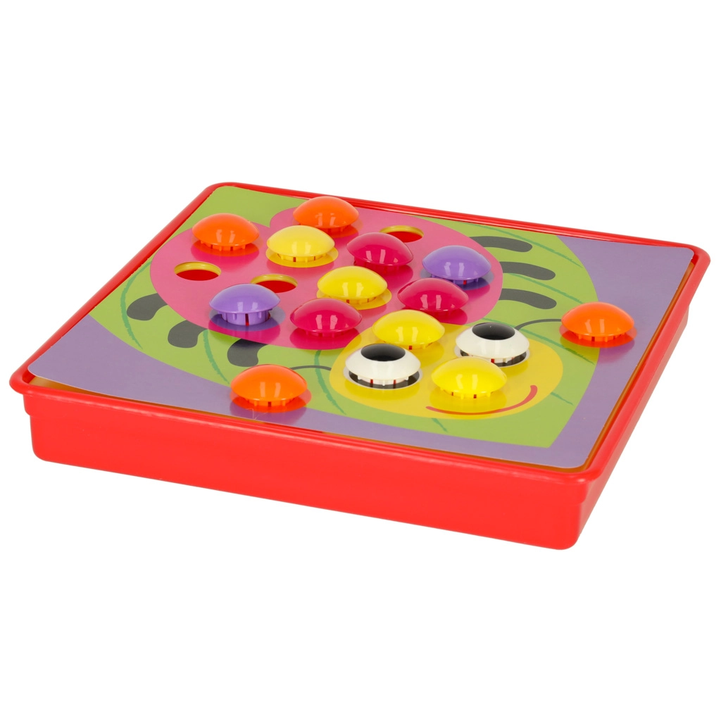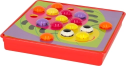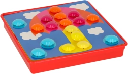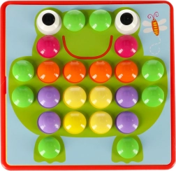 Lielās tapas ir viegli satveramas, un bērni tās ievieto atverēs pēc krāsām – trenējot satvērienu, acu-roku koordināciju un uzmanību. Ideāla pirmā mozaīka pirmsskolniekiem.
