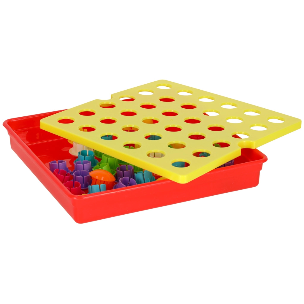 Komplektā ietilpst 10 krāsainas parauglapas ar jautriem motīviem, kas veicina radošumu un krāsu, formu un skaitīšanas apguvi. Stabilā pamatne vienlaikus kalpo kā uzglabāšanas kaste, lai detaļas vienmēr būtu kopā.
