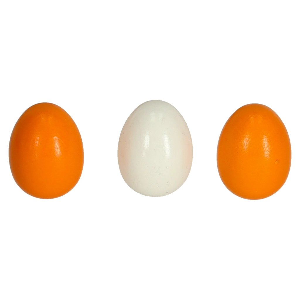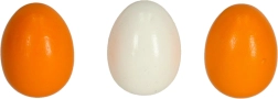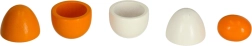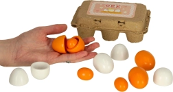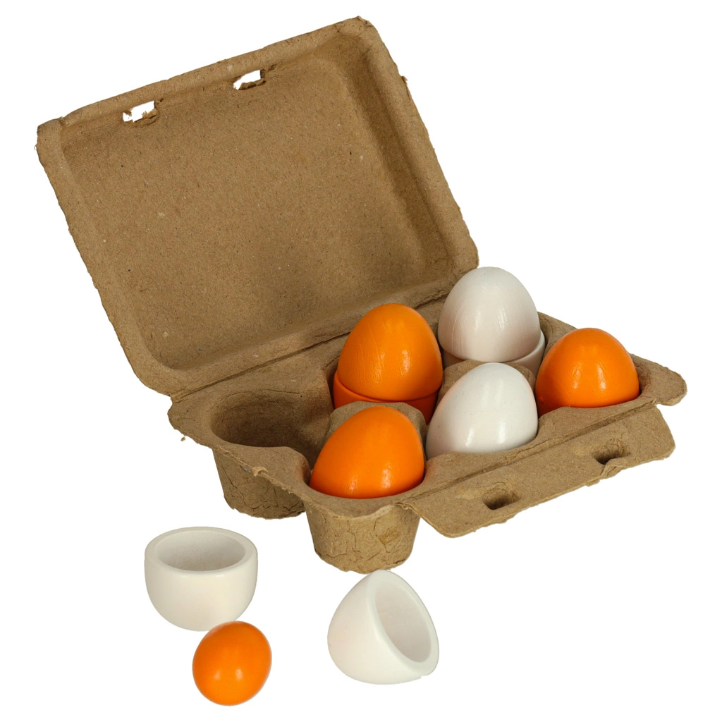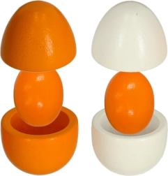 - 1× kartona palete 6 olām, 6× koka olas (3 veselas, 3 ar izņemamu dzeltenumu)