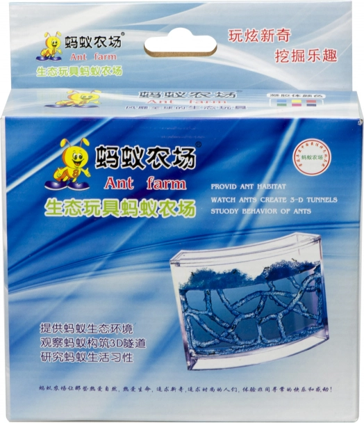 Atklājiet fascinējošo skudru pasauli ar šo caurspīdīgo akvāriju, kas pildīts ar zilu želeju. Ideāli piemērots gan uz rakstāmgalda, gan bērnistabā – izklaidei un mācībām. Nontoksiska želeja kalpo gan kā vide, gan barība, viegla kopšana un lieliska tuneļu redzamība nodrošina stundām ilgu vērošanu.