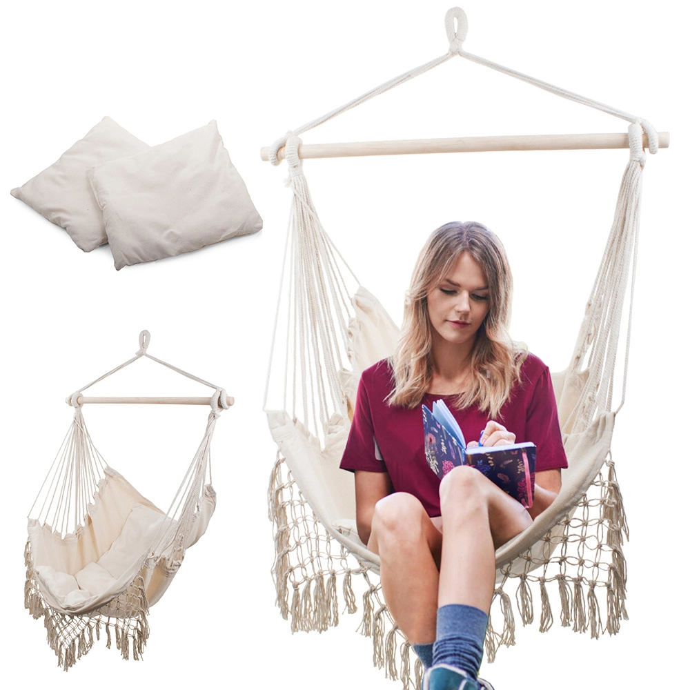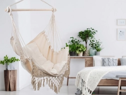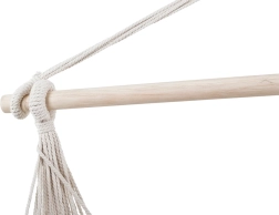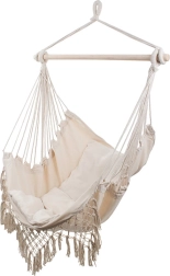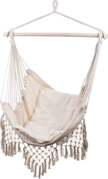 Izbaudiet ideālu atpūtu elegantā boho stilā. Šis piekaramais šūpuļkrēsls ar makramē bārkstīm, koka šķērsstieni un diviem mīkstiem spilveniem piedāvā maksimālu komfortu, stabilu konstrukciju un vienkāršu vienpunkta piekāršanu gan telpās, gan ārā.