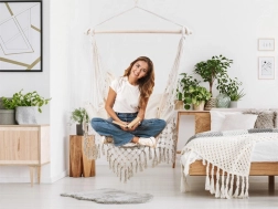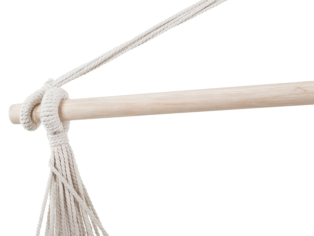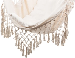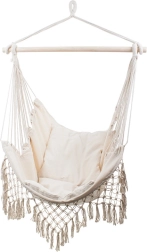 Makramē apmale un dekoratīvie pušķi izceļ boho izskatu, kas lieliski sader ar augiem un dabīgiem aksesuāriem. Pateicoties vienpunkta piekāršanai, krēslu viegli piestiprināt pie griestu āķa vai statīva. Komplektā iekļauti 2 mīksti spilveni vēl lielākam komfortam lasīšanas un atpūtas laikā.