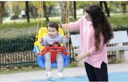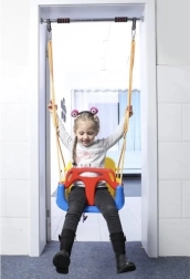 Augstā atzveltne, T‑stienis, regulējamas siksnas un pretslīdes virsma nodrošina stabilitāti un novērš noslīdēšanu šūpošanās laikā.