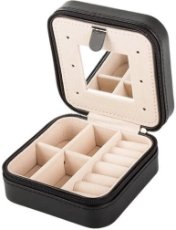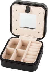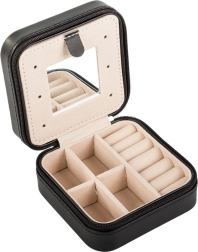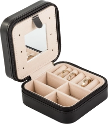 Eleganta ceļojumu rotaslietu kastīte ar kompaktajiem izmēriem lieliski pasargā un sakārto jūsu rotas gan mājās, gan ceļā. Tā piedāvā vairākas nodalījumu vietas, polsterētu sadaļu gredzeniem, āķīšus ķēdītēm un praktisku spogulīti. Pateicoties rāvējslēdzēja aizdarei jūsu aksesuāri ir drošībā, bet mīkstais samta interjers pasargā no saskrāpēšanas.