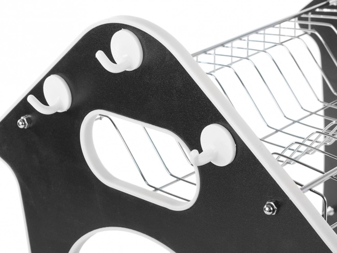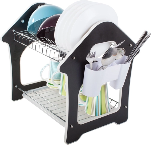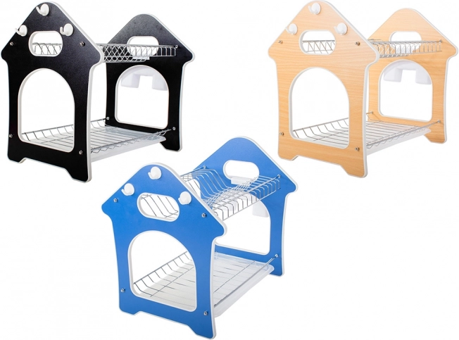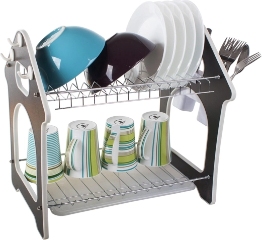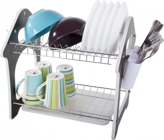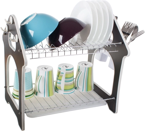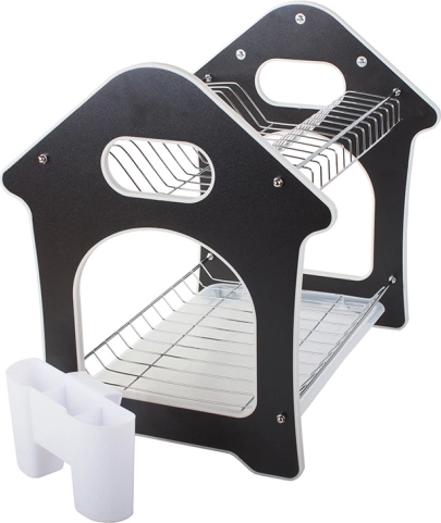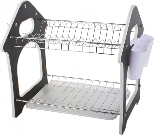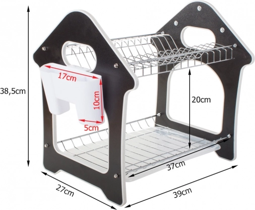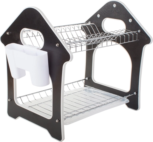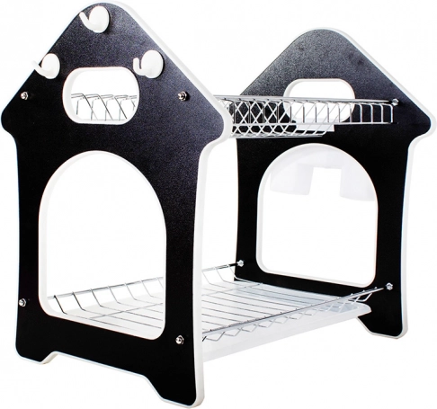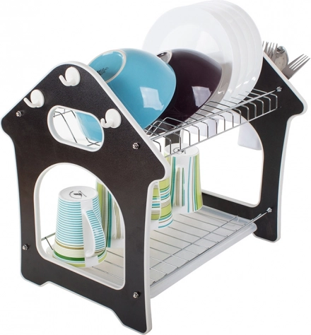 Praktisks divstāvu trauku žāvētājs ar paplāti ūdens noteces savākšanai, piederumu turētāju un trim āķiem virtuves piederumiem. Piedāvā lielu ietilpību, izturīgu metāla un plastmasas konstrukciju un stabilu pamatni, kas aizsargā darba virsmu no mitruma. Stilīgs mājiņas formas dizains lieliski iederēsies jebkurā virtuvē.