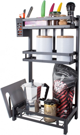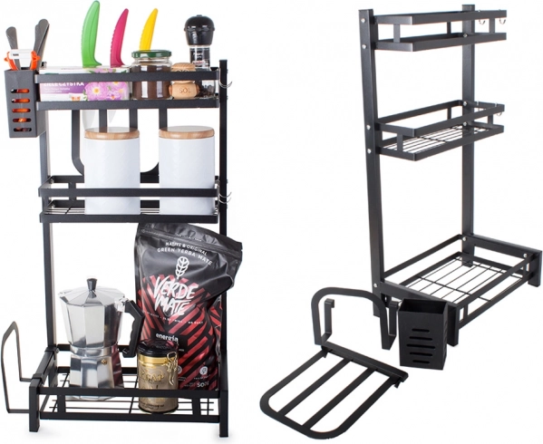 Metāla trīsstāvu virtuves organizators ir neaizstājams palīgs efektīvai virtuves sakārtošanai. Izgatavots no augstas kvalitātes metāla ar pulverkrāsojumu, izstrādājums ir izturīgs pret bojājumiem un mitrumu. Stabilā konstrukcija ļauj uz organizatora novietot arī smagākus priekšmetus.