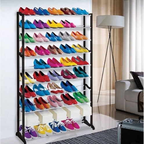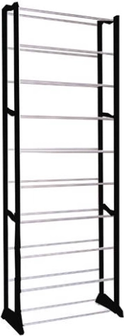 Sakārtojiet savus apavus gudri un stilīgi. Šis daudzstāvu apavu plaukts ar 10 plauktiem ietilpina līdz 50 pāriem, tāpēc viegli tiks galā ar ģimenes kolekciju un sezonālajiem apaviem. Melns rāmis ar hromētām šķērslatām iederas modernā interjerā, bet kompaktā 25 cm dziļuma dēļ tas iederēsies arī šaurākās vietās.