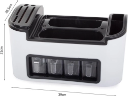 Atvieglojiet kārtības uzturēšanu savā virtuvē ar šo praktisko virtuves organizatoru. Tas piedāvā daudzlīmeņu konstrukciju, kas nodrošina ērtu piekļuvi visiem nepieciešamajiem priekšmetiem. Augšējā līmenī varat ērti novietot iecienītās garšvielas, burkas vai pudeles. Sānos ir vieta virtuves instrumentiem, piemēram, nažiem, dakšām vai lāpstiņām.