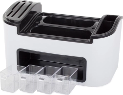 Organizatora apakšējā daļā ir četras ietilpīgas atvilktnes no estētiska caurspīdīga plastmasas, ideāli piemērotas kafijas, tējas vai cukura glabāšanai. Katra organizatora sastāvdaļa ir viegli noņemama rūpīgai mazgāšanai, bet pamatne kalpo kā notecētājs sausuma nodrošināšanai.