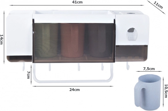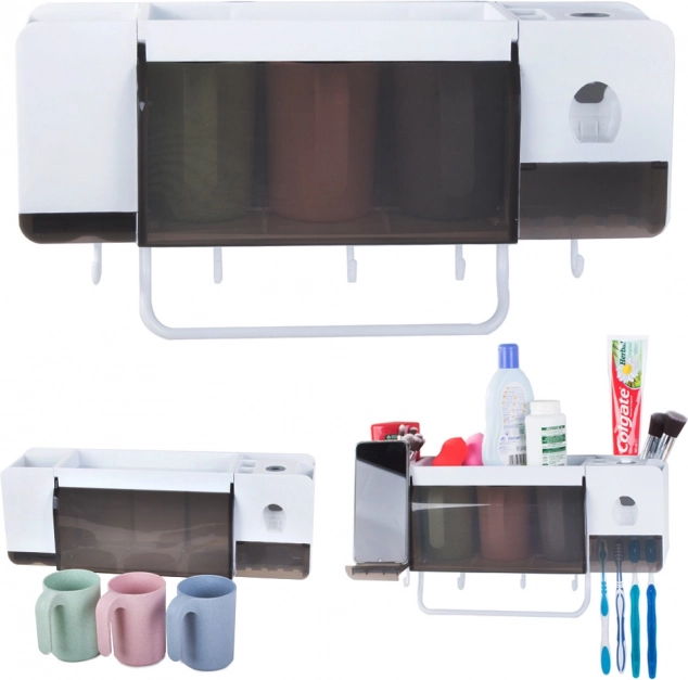 Gudrais vannasistabas organizators apvieno glabāšanu birstītēm, pastei un kosmētikai vienā kompaktā risinājumā. Automātiskais zobu pastas dozators atvieglo ikdienas higiēnu, savukārt piederumu nodalījumi ietilpina krēmus, meikapa otas vai dezodorantus. Trīs izturīgas plastmasas krūzītes (300 ml) ir ideāli piemērotas visai ģimenei.