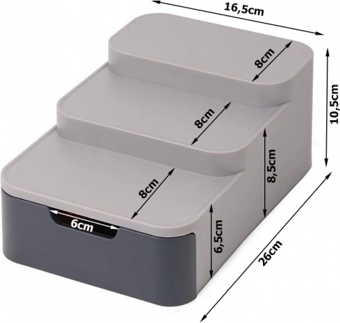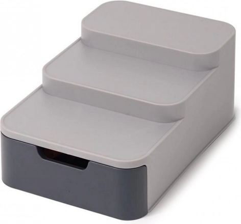Šis kompaktais organizators efektīvi izmanto vietu jūsu pieliekamajā vai skapītī. Trīs pakāpieni nodrošina labāku redzamību burciņām un bundžām aizmugurējā rindā, savukārt izvelkamā atvilktne ietilpina maisiņus, tūbiņas un citus sīkumus. Izturīgā pelēkā plastmasa ir viegli kopjama un lieliski iederas modernā virtuvē.