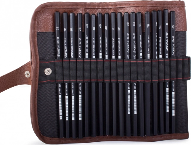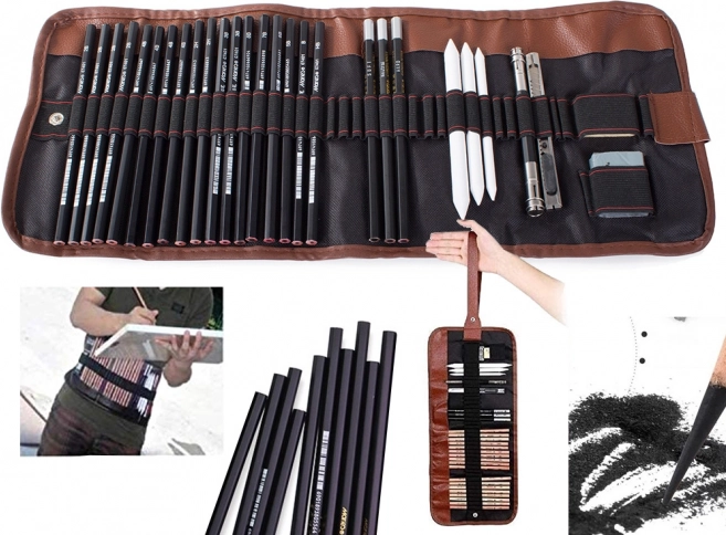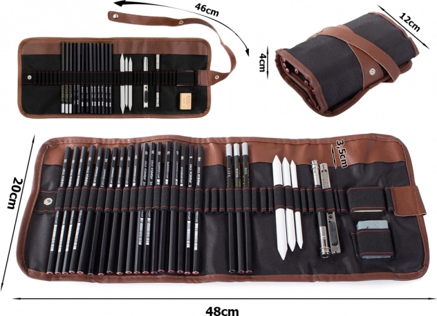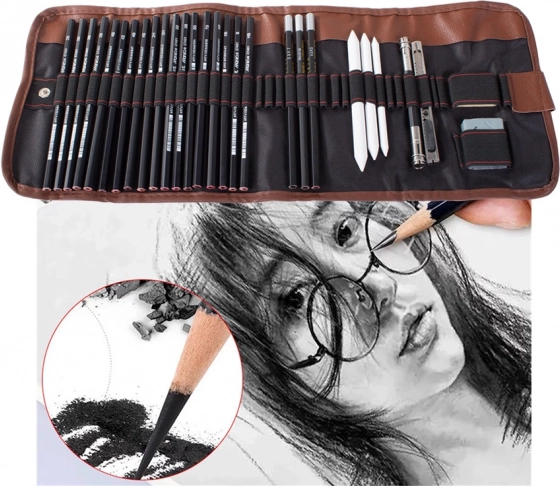 Šis profesionāli nokomplektētais sets piedāvā plašu zīmuļu cietību klāstu no 8B līdz 2H, kā arī kvalitatīvas koka ogles trīs cietības pakāpēs. Pateicoties bagātīgajai rīku izvēlei, jūs viegli izveidosiet izteiksmīgas ēnas, smalkas šrafējumus un asas kontūras. Grafīts viegli izplūst un ļauj ātri aizpildīt laukumus, savukārt cietāki zīmuļi nodrošina precīzas tehniskās līnijas.