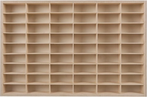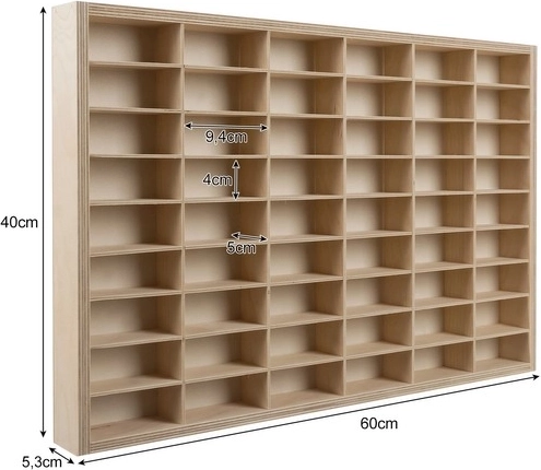 Gudrā noņemamo starpsienu sistēma no 3 mm saplākšņa ļauj mainīt izkārtojumu pēc vajadzības – izveidojiet mazākus vai lielākus nodalījumus tieši jūsu kolekcijām. Plaukts ir sagatavots montāžai pie sienas, taču to var arī novietot uz kumodes vai galda. Iepakojumā atradīsiet montāžas komplektu un 2 iekaramos āķus drošai stiprināšanai.