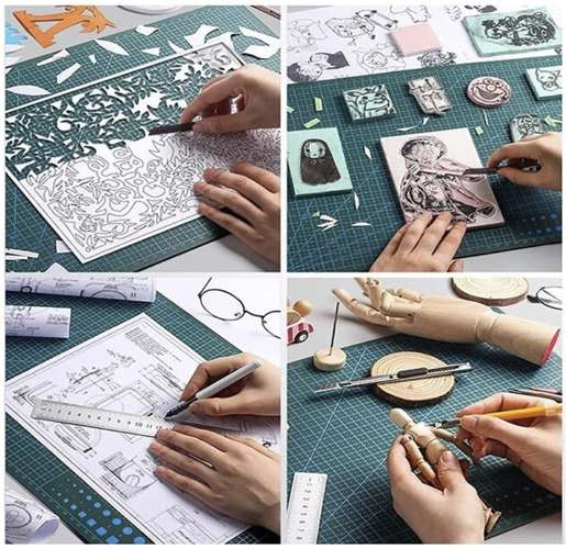 Abpusējas mērrežģa līnijas, leņķu un apļu palīglīnijas paātrina materiāla izlīdzināšanu un uzlabo precizitāti. Pretslīdes materiāls stingri turas vietā, lai varētu droši strādāt ar griezēju, skalpeli vai rotācijas griezēju.
